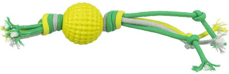 Trixie Játék labda kötélből 9x44cm Trixie - Small sausage with rope vinyl 11 cm Nagyon puha műanyagból készült játék. Könyen tisztítható és eldobható. A kutyatulajdonosok felelőssége hogy a törött játékot kicseréljék melynek darabjait nem tudja lenyelni a kutya.