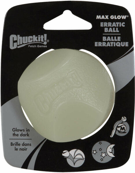 A Chuckit! Max Glow Erratic labda egy kiszámíthatatlanul pattogó gumilabda, amely elnyeli a fényt, majd a sötétben világít. A Max glow technológiának köszönhetően a labda feltöltődik, amellyel az esti és az éjszakai játszadozások sem jelentenek kihívást. Napfénnyel is feltölthető, de igazán a lámpafénnyel világít meseszerűen. Különleges formájának köszönhetően