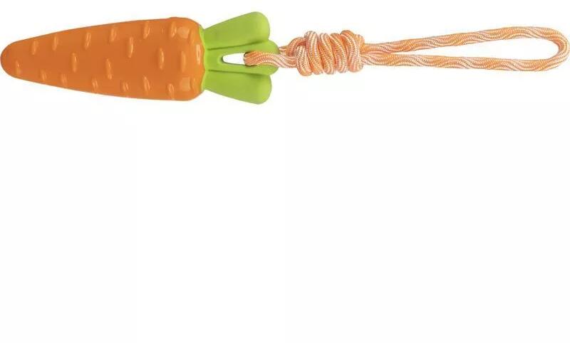Trixie répa alakú kutyajáték kötéllel A sárgarépa formája tökéletes a kellemes megrágcsálásra, és a színes sárgarépa kötéllel ellátott játék biztosan örömet okoz majd négylábú barátjának. A strapabíró kötél lehetővé teszi a könnyű rángatást és dobálást, míg a beépített sípoló további élvezetet nyújt a játék során. Az anyag fogbarát, így akár