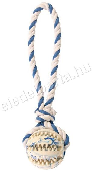Természetes gumiból készült labda pamut kötélen. Masszírozza a fogínyt. Játék házi kedvencek részére. Anyaga: az állat szempontjából biztonságos anyagból készült (gumi, latex, műanyag, plüss, fa vagy fém). Ne hagyja kedvencét felügyelet nélkül a játékkal!