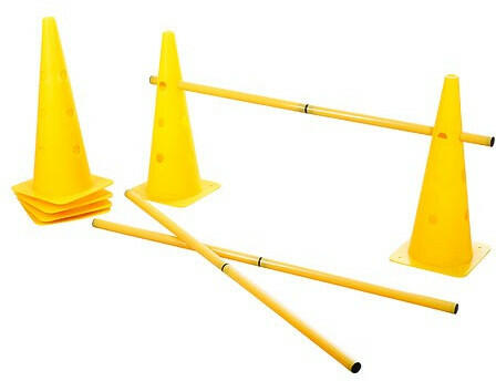 2 az 1-ben - akadály- és szlalompálya egyben állítható magasság 6 kúp (21 x 21 x 46 cm) és 3 műanyag oszlop (hossza: 1 m) állítható magasságú akadályok (11 cm, 21 cm vagy 31 cm) a műanyag oszlopok helytakarékosan egymásra helyezhetők