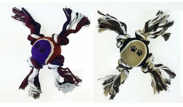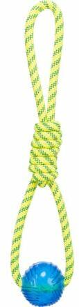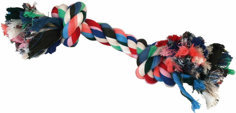 Pamutkeverékből készüt színes rágókötél csomókkal kutyáknak. A fogtisztító hatása révén ápolja a fogakat és fogközöket játék közben. Mérete: 26 cm