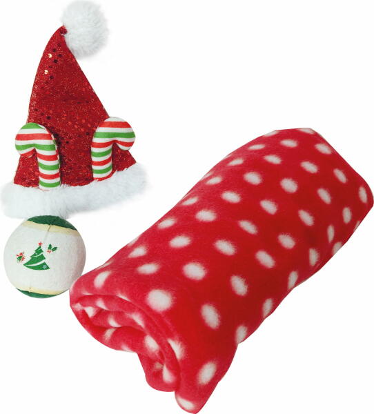 Ajándékszett kutyáknak Takaróval, labdával és sapkával Ideális karácsonyi ajándékként