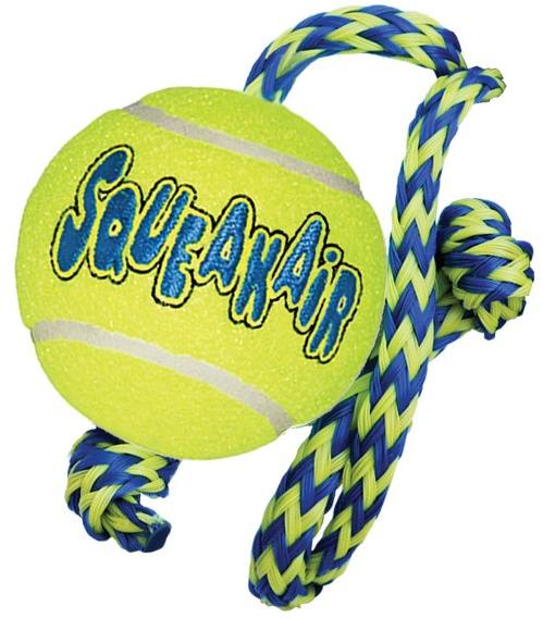 A KONG Air Squeaker AirDog Ball egy klasszikus kutyajáték kötélle, mellyel jó messzire el tudjuk dobni kedvencünknek a labdát. A tartós, kiváló minőségű anyagnak köszönhetően nem nem károsítja a kutya fogát (nem tartalmaz üveggyapotot). Ráadásul sípol is!