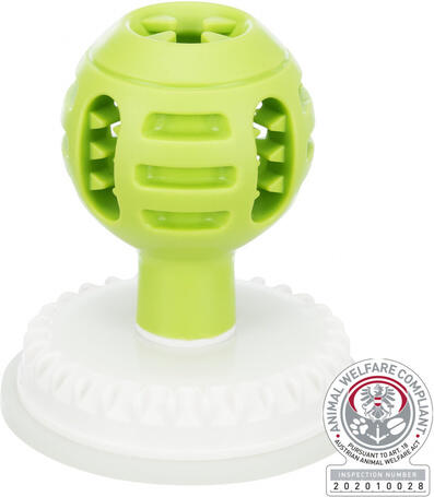 Trixie Lick'n'Snack Ball gumiból, műanyag talppal. Belsejébe különböző paszták, jutalomfalatok adagolhatók, melyet a kutya nyalással szerezhet meg. Lefoglalja a kedvencünk figyelmét, így a fürdetés, körömvágás egyszerűbben kivitelezhető. Az alján található tapadókoronggal stabilan rögzíthető bármilyen sima felszínhez.