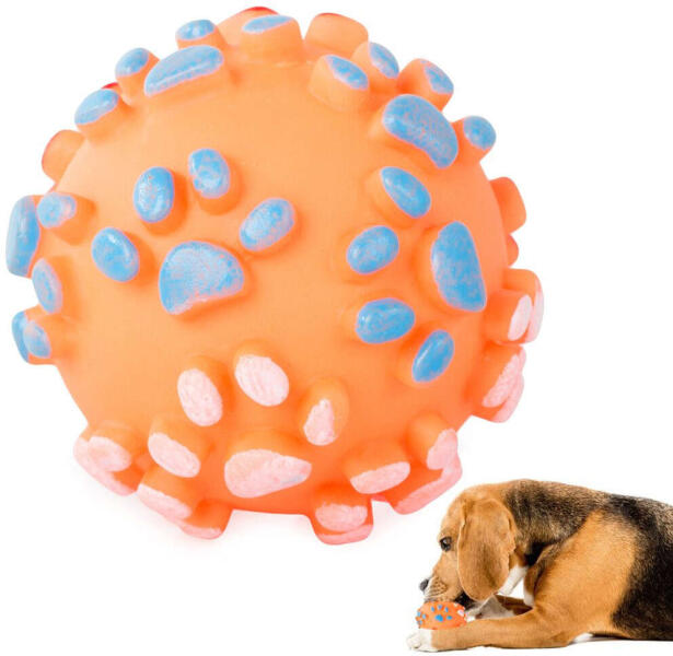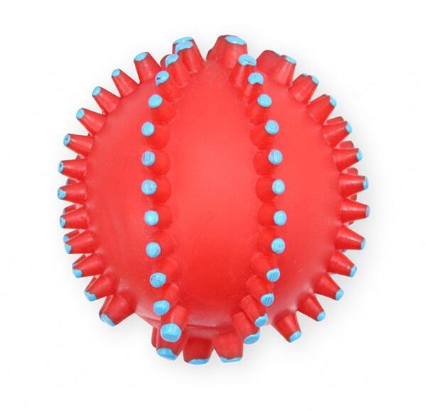Vinylből készült kutyajáték, sípoló, tövises labda. Megfelel ideges kutyáknak, ill. íny masszírozó funkciója is van. Mérete: 10,5 cm