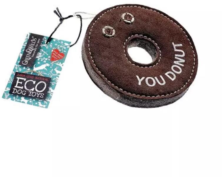 YOU DONUT! Ez a fánk akár mondhatná azt is, hogy ne merészeld a környezetet szennyezni! Egy elkötelezett környezetvédő fánk! He-he-he! DONUT szarvasbőr maradékokból készült, amelyet erős öltésekkel sok réteg 100%-ban lebomló juta anyaggal varrtunk össze. Alakjának köszönhetően remekül repül, gurul, kiváló apportjáték. A kizárólag természetes anyagokból készülő