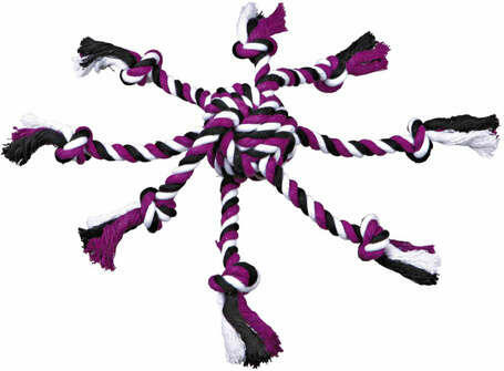Trixie csillag alakú rágókötél középen labdával kutyáknak, anyaga pamut/poliészter, kötött labda átmérője 7 cm.