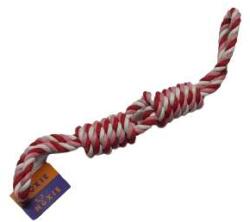 Nagy XXL pamut szál kutyajáték, 45 cm, többszínű/piros A játékot bármilyen korosztályú, közepes és nagytestű kutyák számára tervezték. A játék vastag, szoros szövésű, színes pamutból készült, nagyon ellenálló kötélből. Segít megőrizni a kutya szájhigiéniáját, mert játék közben a pamutszálak tisztítják a fogakat és masszírozzák az ínyt. Műszaki adato
