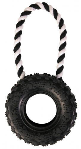 Játék kutyák számára, autógumi kötéllel. anyaga: natúr gumi és szövet kötél mérete:Ø= 15cm, hossza: 31cm ajánlott közepes- és nagytestű kutyáknak