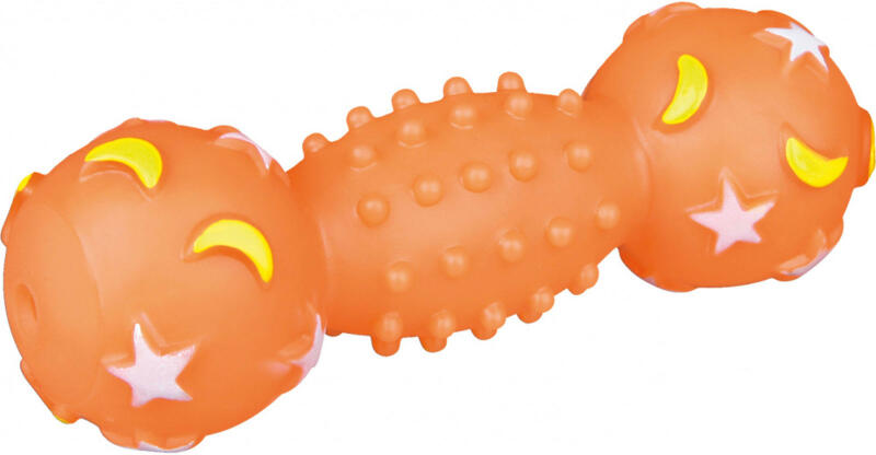 Sötétben világító súlyzó formájú csipogós játék kutyáknak hogy ne legyen akadály a sötétedés Alakjának köszönhetően könnyű az állatnak a szájába vennie Anyaga Vinyl mérete 18 cm-es narancssárga és fehér színben kaphatóA világítás érdekében használat előtt fényforrás elé kell helyezni Az állat biztonsága érdekében felügyelet mellett használja az álla