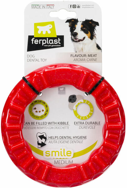 A zooplus. hu kínálatából: Kösse össze a kellemeset a hasznossal – ez a kutyáknál is alkalmazható. Az Ön négylábú kedvence is szívesen fog játszani a csillogó gyűrűvel és örömét fogja lelni a jutalomfalatok megszerzésében, a Ferplast Smile rágógyűrű egyenetlen felülete pedig gondoskodik arról, hogy a fogain ne legyen fogkő és lepedék. Ezenkívül a rágás enyhé