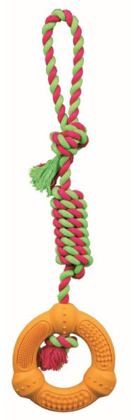 Denta Fun Karika Kötélen 12cm/41cm Denta Fun fogtisztítós játék kötél, gumi karikával. A különleges barázdák játék közben tisztítják a fogakat, fogközöket, így segítenek a fogkő kialakulását megakadályozni. A puha barázdák a fogínyt masszírozzák. pamut / poliészter természetes gumiból gyűrű kézzel hurokkal különösen dobálos és húzós játékokhozMéretek: