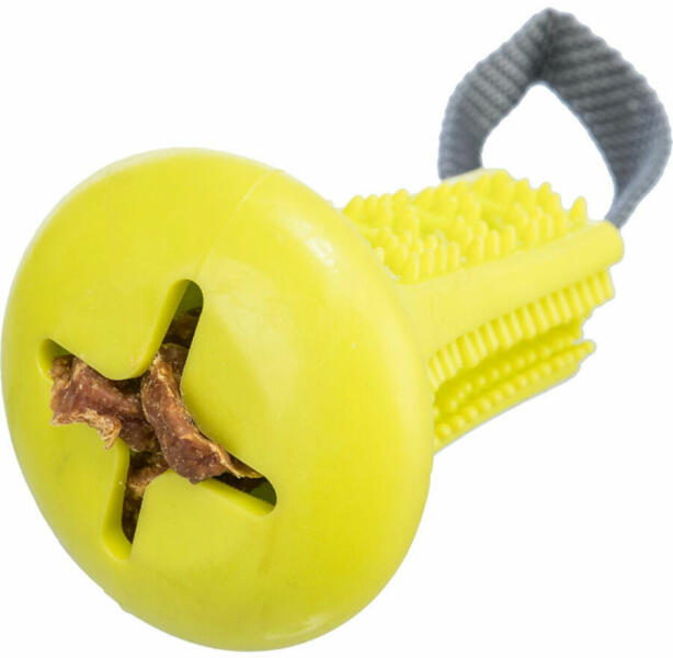 A TRIXIE Jutalomfalat tartó játék további jellemzői: rugalmas gumiból készült, jutalomfalattal tölthető játék masszírozza az ínyt a játéknak nincs hangja Méret: 11 x 22cm Színek: fehér, sárga, pink A játék vegyesen érkezik, ezért a választott színt nem minden esetben tudjuk garantálni.