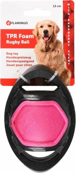 Flamingo habszivacs játék kutyáknak. Jellemzők : - Kutyák szórakoztatására kialakított, rögbi labda formájú, nyomásra sípoló hangot kiadó játék. - Mérete: 13 cm