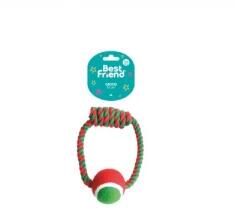 Pamut gyűrű teniszlabdával kutyáknak. Tökéletes játék a kutyával való kötélhúzáshoz és sok más mozgásos tevékenységhez. Piros, zöld és fehér: a stílus a karácsonyra emlékeztet.