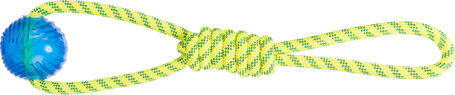 Flamingo kötél játék kutyáknak teniszlabdával és a kötélből formázott hurokkal melynél fogva jól meg lehet markolni. Apportírozáshoz, rágcsáláshoz, huza-vona játékhoz is kiválóan alkalmas. A kötél rész pamutból készült. Több színben kapható.