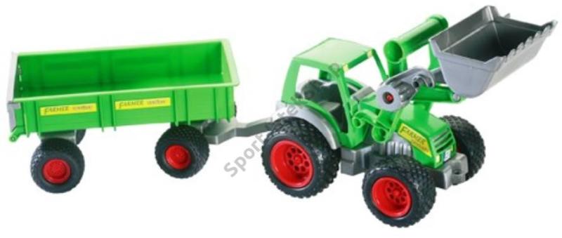 Fémtengelyes farmer traktor utánfutóval és homlokrakodóval minőségi alapanyagokból, valódi gumikerekekkel, akár intézményi felhasználásra is. Emelhető homlokrakodó, lecsatolható és nyitható kéttengelyes utánfutó. Csomagolás mérete: 570×165×200 mm. 24 hónapos kortól ajánlott! WADER minőség!