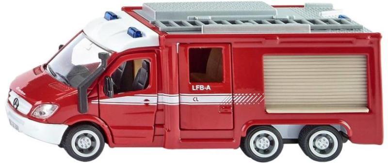 Nagyobb piros tűzoltóautó, létrával felszerelve! Az 1:50 méretarányú Siku: Mercedes-Benz Sprinter furgon egy fémből és műanyagból készült tűzoltósági jármű, nyitható ajtókkal. A tűzoltóautó létráját fel tudod emelni, a furgon élethű kidolgozottsággal lett elkészítve. A játék együtt használható más SIKU 1:50 méretarányú játékkészletekkel, járművekkel i