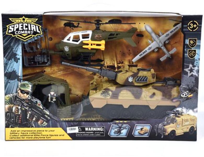 Special Combat katonai bázis harci járművekkel játékszett Hivatalos magyarországi forgalmazótól. Leírás: Ez a katonai játékszett garantáltan izgalmakban és akcióban gazdag játékélményt kínál a kis srácok számára, akik örömmel találnak ki kalandokat és veszélyes bevetéseket a katonák számára. A készletben található egy katonai sátor ami kiválóan alkalmas ellen