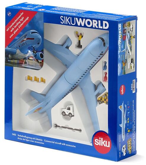 Az új kereskedelmi repülőgép kibővíti a SIKUWORLD világát egy másik kedvenc játék témával. Felszállás ideje az SW 5402 járatra. A nagy teljesítményű (38,5 cm) két hajtóműves repülőgép készen áll a felszállásra. De ki hol ül? A kabin személyzetének csak fel kell emelnie az elülső fedelet a tetőn, és el kell mozgatnia a négy már ülő utast. A hátsó szárny ny