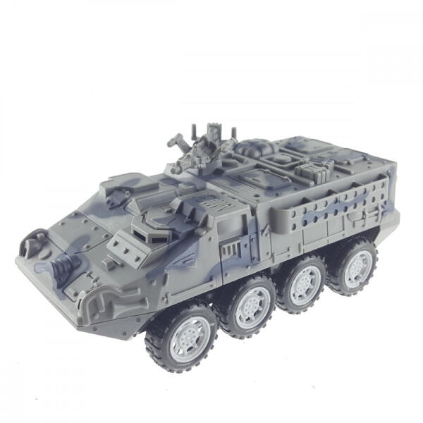 Harcászati terepjáró lövegtoronnyal, 3 éves kor feletti gyermekeknek. Mérete: 17cm Nyolc kerekű harcászati terepjáró lövegtoronnyal ellátva. Színe : Világos terep, és sötétebb terep színű Anyaga ABS műanyag.