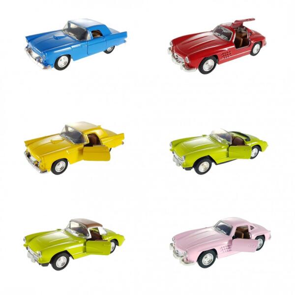 Old timer autó, 3 éves kor felett. Bővítsd autóparkodat ezekkel a klassz old timer autókkal. Élénk színeivel kitűnnek a többi járgány közül, ajtaja mindnek nyitható. A karosszéria fémből készült. Mérete: 12 cm Anyaga: fém, műanyag