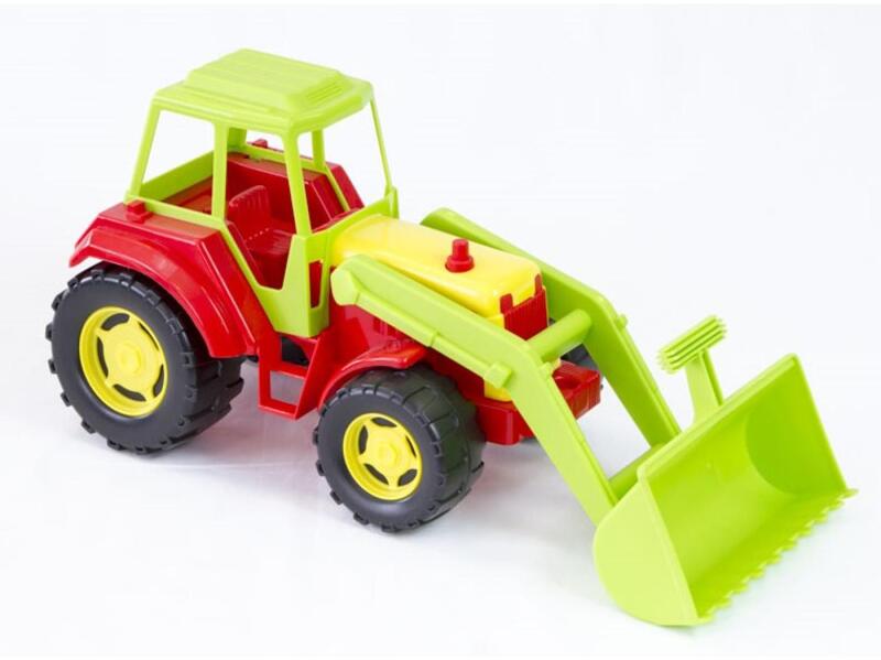 Műanyag traktor vidám színekben. A lapát manuálisan mozgatható. Mérete: 46 cm.