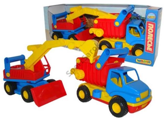 A készlet két darab, strapabíró műanyagból készült ConsTruck munkagépet tartalmaz. Mindkét gép két fémtengellyel, valódi gumikerekekkel és mozgatható funkció- elemekkel rendelkezik. A csomagolás mérete: 570×165×200 mm. Színbeli eltérés lehetséges. Az ár 1 készletre vonatkozik. WADER minőség! "