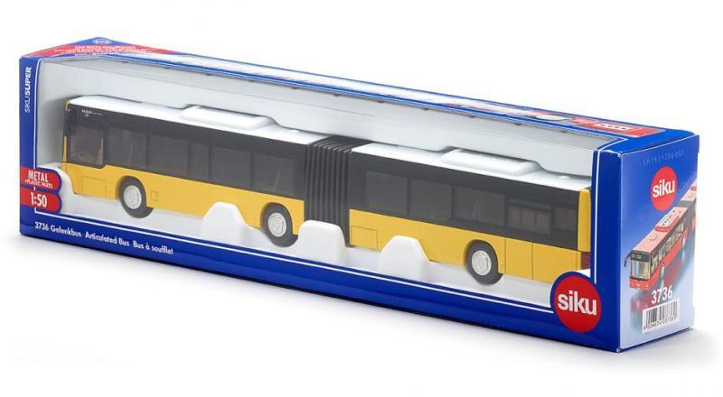 Siku 3736 Man sárga csuklós busz mozgó csukló résszel és 36 cm-es hosszúsággal! A nyitható ajtókkal és motorháztetővel rendelkező Siku sárga csuklós busz fém alvázra épült, valódi gumi kerekekkel, melyekből a két hátsó tengelyen dupla kerekek kaptak helyet. A Siku 3736 Man sárga csuklós busz mérete: 36.5 x 5.9 x 6 cm, méretaránya: 1:50. Siku 3736 MAN Lion's City GELB