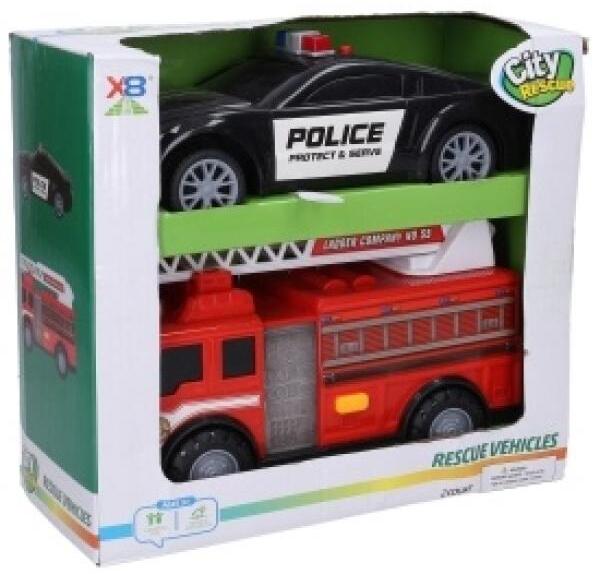 Rendőrség és tűzoltóautók hatásokkal. Mérete 23 cm. Szabad kerekek. Fény- és hangeffektusok gombbal a rendőrautó tetején és gombbal a tűzoltóautó bal oldalán. Minden autóhoz 2xAG13 akkumulátor tartozik. 3+ életkor