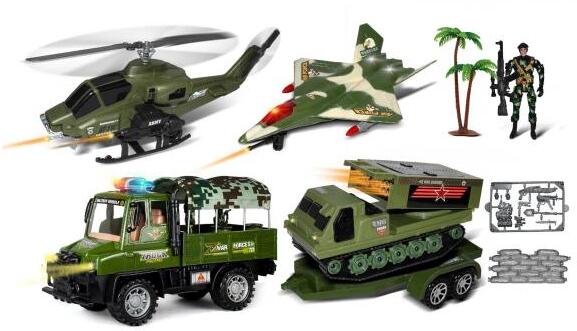 Katona autó utánfutóval és katonával. A kocsi utánfutóval mérete 63 cm. Kor: 3+ Tartalmazza autó, utánfutó, rakétavető, vadászgép, helikopter, katona figura, kiegészítők.