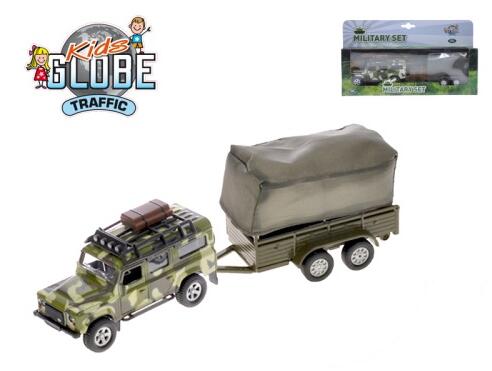 MIKRO TRADING - Kids Globe Traffic Land Rover Defender Military 14,5cm-es fém hátuljáró utánfutóval egy rákban