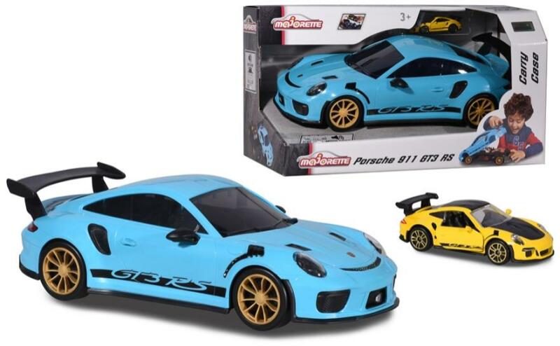 A francia Majorette márkanevet viselő Porsche kisautó dobozban gyerekeknek 3 éves kortól ajánlott. A licenszelt Porsche 911 GT3 RS autó valódi modell alapján készült, és eredeti dizájnnal rendelkezik. A karosszéria felső része levehető, az autó belsejében 9 db 7,5 cm hosszú kisautót tárolható doboz van - a csomag 1 db sárga Porsche 911 GT3 RS mini modellt tartalmaz fém kar