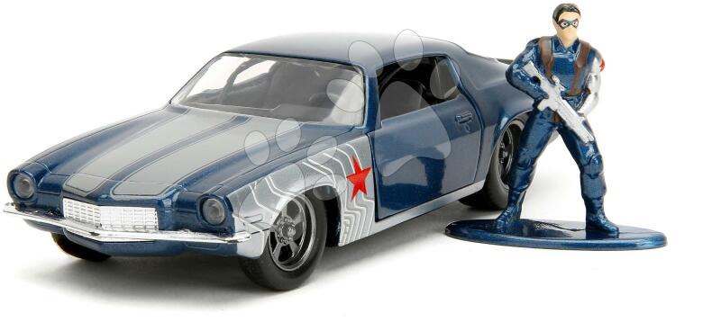 Kisautó Chevrolet Camaro 1973 Marvel kék-szürke színváltozatban egy igazán egyedi ajándék a lelkes gyűjtőknek és gyerekeknek 8 éves kortól. A 14 cm hosszú, fémből készült fekete játékautó és a hozzá tartozó 4 cm magas Winter Soldier fémfigura lenyűgözi a gyerekeket. A licenszelt, stílusos, szabadonfutó játékautó nyitható ajtókkal, csomagtartóval és motorháztet