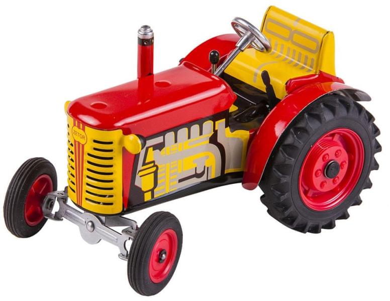 Festett fémből készült KOVAP piros Zetor traktor, amely felhúzható szerkezettel működik. Kormányozható első kerekekkel és sebességváltóval lehet irányítani. Előre és hátra is tud haladni.