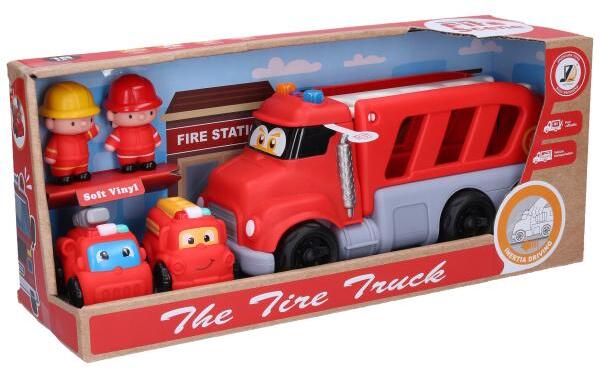 Tűzoltó autó készlet 4 db. autó mérete 26 cm. Fény- és hanghatások. Fékezési rendszer. 3xAG13 elem tartozék. Kor: 2+ Tartalmazza nagy autó, 2 kis autó 7 cm, 2 figura.