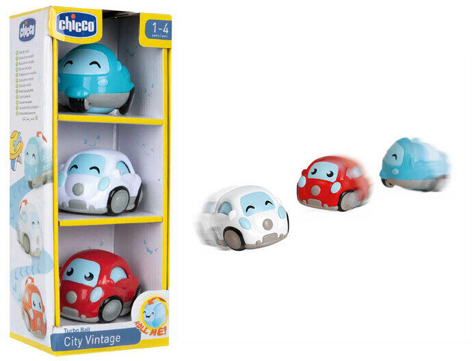 3 mini autóka vintage stílusban az első városfelfedezéshez. Bármely irányban mozoghatnak 3 mini jármű egyedi tervezéssel, aranyos kifejezésekkel és motívumokkal Kék autóka Tucky, fehér Beety, piros Maggie Egyszerű játék: tolják, húzzák, fordítsák és pörgetik Kompatibilis a Chicco Electronic City játékalátéttel és a Chicco Rolling Truck teherautóval. Méretek 6 × 6
