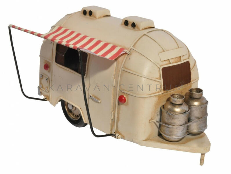 Látszatra egy valódi antikvitás! Részletgazdag megmunkált lakókocsi modell lemezből, valódi gumiabroncsokkal, nyitható szövet előtetővel. Hossz: kb. 24 cm Fontos! A lenyelhető apró alkatrészek miatt nem adható 3 éves kor alatti gyermeknek!