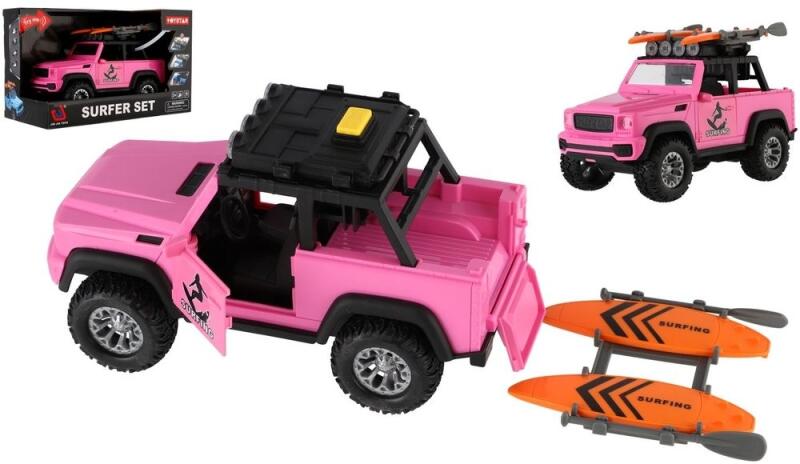 Autómodell szörfözés és kaland imádóknak. A tetőn 2 szörfdeszka és evező található. Rózsaszín autójának köszönhetően vonzza a figyelmet, és 22 cm méretű. Az elemekel működő autó nyitható ajtókkal rendelkezik, és lendkeréken van. A termék 3 x AG13 elemet tartalmaz. Csomag méretei: 27 x 16 x 13 cm. 3 éves korú gyermekek számára alkalmas.