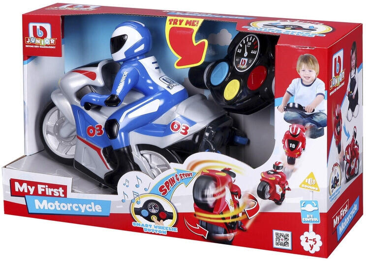 Motorkerékpár a fiatal generációnak: A BBJunior "My First R/C Motorcycle" gyerekeknek készült, és könnyen irányítható az egyszerű mozgásérzékelős vezérlővel. Menet közben a kerékpár vicces zenét és hangokat szólaltat meg. Ezenkívül a sárga kerekes gomb megnyomása után tökéletes 360°-os kerekes mutatványt hajt végre. A játékmotor 2 és 5 éves kor közötti gyerm