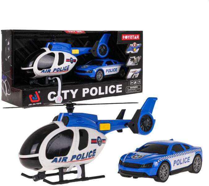 Az interaktív rendőrautó és helikopter készlet 3 éves kortól alkalmas gyermekek számára. A készlet a legjobb minőségű műanyagból készült, élénk színekben. A helikopter rendelkezik egy gombbal, amely aktiválja a fény- és hangfunkciókat. A gomb megnyomása aktiválja a helikopter első és hátsó lámpáit, valamint megszólaltatja a helikopter repülési hangját és riaszt
