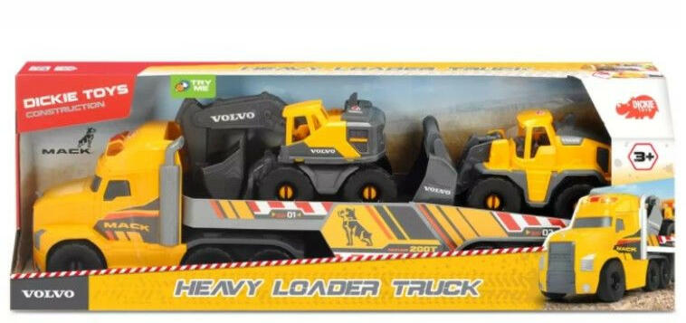 A Dickie Óriás Mack szállító kamion egyszerre két munkagép szállítására is alkalmas. A játékszetthez egy Volvo homlokrakodó és egy Volvo markoló tartozik. Mindkét munkagép mozgatható részekkel van ellátva, így a játék építkezés igazán élethű lesz. Az utánfutó lecsatolható, így a kamion könnyeben tud haladni, amikor éppen nem vontat. A Mack játék kamion gombnyo