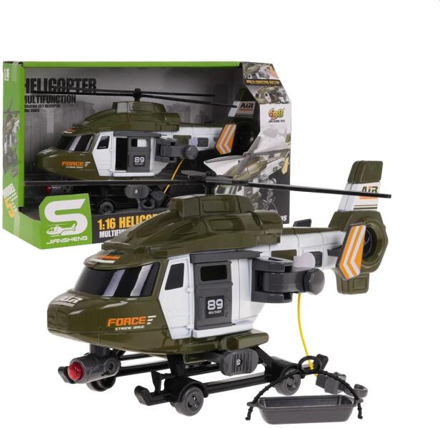 Az 1:16 méretarányban készült interaktív katonai mentőhelikopter 3 éves kortól gyermekek számára készült. A kíváló minőségű műanyagból készült, élénk színekben. A helikopter mozgatható elemekkel rendelkezik, mint például nyitható ajtó, mozgatható horog kosárral, kerekek és propellerek. Az ajtót balra vagy jobbra mozgatva nyitjuk, a kosarat pedig a kerék forgatás