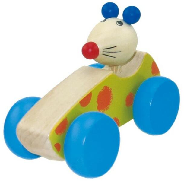 Fából készült kisautó egér sofőrrel, felkelti már az egészen kicsi gyerekek figyelmét is. Az egér versenyautója sajtmintás díszítést kapott. Az autó kerekei szabadonfutók és szintén fából készültek.