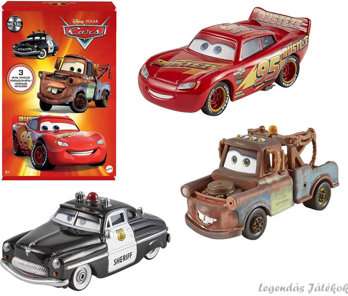 3 db-os Verdák Cars karakter kisautó szett. A szett tartalmazza Villám McQueen, Sheriff és Matuka kisautót. Az autók kb 7 cm szélesek. Eredeti licenszelt Disney Pixar Mattel termék, azonosító: HBW14 A Cars egy 2006-ban készült amerikai animációs sport vígjátékfilm, amit a Pixar Animation Studios készített és a Walt Disney Pictures forgalmazott. A történet egy világban játsz