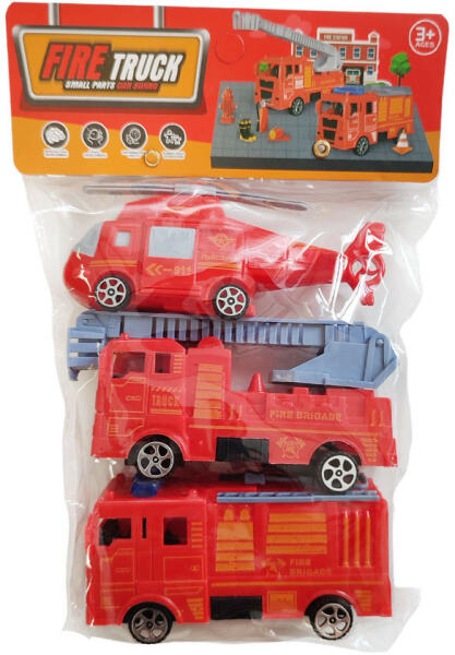 Egy klasszikus tűzoltó autót, egy tűzoltó létrával ellátott tűzoltó autót és egy tűzoltó repülő gépet tartalmazó kisautó szett. Ez a szett 3 db piros tűzoltó járművet tartalmaz. Egy klasszikus tűzoltó autót, egy tűzoltó létrával ellátott tűzoltó autót és egy tűzoltó repülő gépet. Egyszerű, vékony műanyagból készült 10 cm járművek, gurítható kerekek