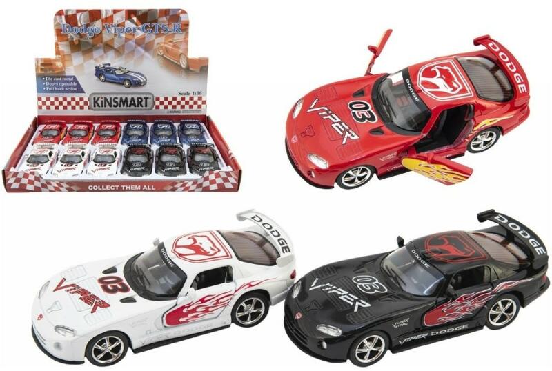 A Dodge Viper GTS-R autó gyönyörű fém modellje 1:36 méretarányban. A játékautó kinyitható ajtóval rendelkezik, és hátrahúzós. Négy színváltozatban kapható. A termék méretei: 13 x 6 x 3 cm. 3 évesnél idősebb gyermekek számára alkalmas.