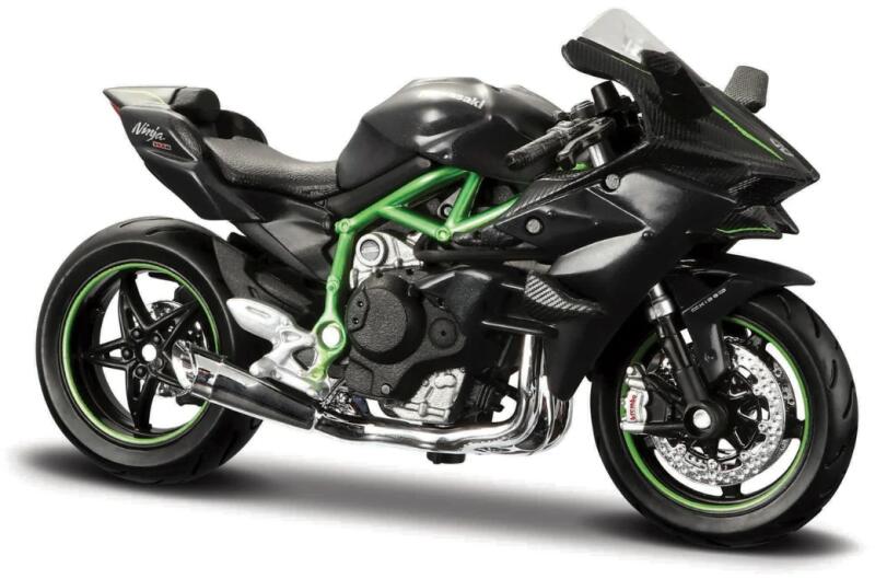 Maisto Kawasaki Ninja H2 R motorkerékpár modell. Kiváló minőségű kivitelezés. A motorkerékpárnak forgó kormánya és rugózott hátsó tengelye van. Fém alkatrészek. Méretarány 1:18. Modell hossza kb 12 cm.