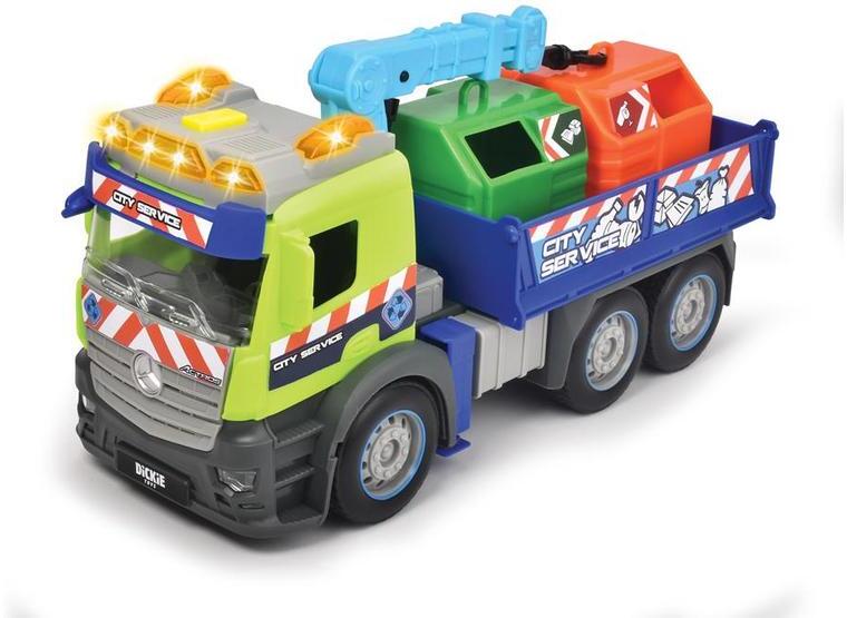A legújabb Dickie Action Truck játék szelektív hulladékszállító - 26 cm segítségével a város modern és hatékony tisztán tartása nem lesz nehéz feladat! A Mercedes márkájú járgány tetején lévő gomb megnyomásakor hallhatjuk az induló jármű hangját, a fülke tetején lévő lámpák pedig villognak. A jármű platójának két oldala is lehajtható és a forgatható emel